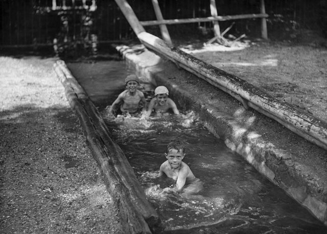 In 1932 France, these boys in bathing caps rinse off (while splashing and playing around, too!) in a river in the Bois de Boulogne. And, in fact, this isn’t just a river—it’s also an obstacle on a horse trail! They might need another bath after this bath.