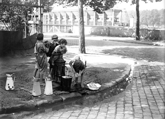 In 1929 France, these children fill up water jugs and buckets—and do a little self-cleaning as well—at a fountain on a Parisian street.