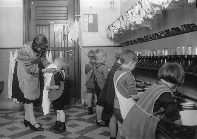 Proper hand-washing has always been one of the earliest skills children should learn. Just as today’s might, these kindergarteners from 1930 wash their hands and faces; one boy gets his face toweled off by the teacher, perhaps after snack time. Get a look at more photos showing what school was like 100 years ago.