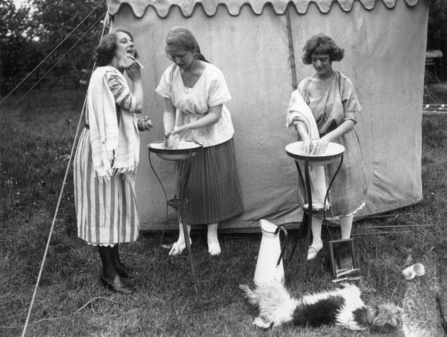 In 1923, this trio of English campers washes up outside their tent using these handy-looking (if maybe not super sanitary) basins. Note the mirror and hairbrush perched against the legs of one! Next, find out what another day-to-day necessity—food shopping—looked like 100 years ago.