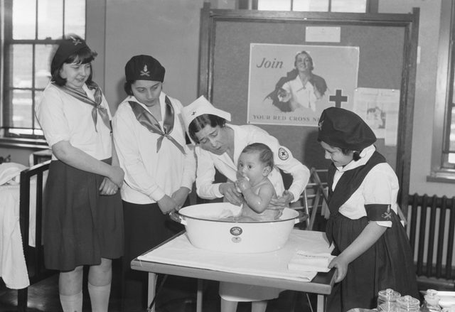 In New York, the Camp Fire Girls’ 1932 demonstration on “how to bathe a baby” takes a chuckle-worthy turn when the baby puts the soap in his mouth! Clearly the Red Cross nurse is more than a little concerned, but the girl on the right certainly seems to be enjoying the tot’s antics. Here are some more funny baby photos that will make you laugh out loud.