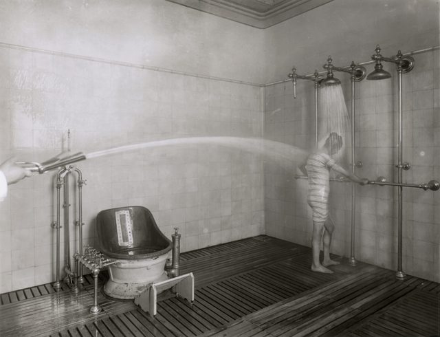 This swimmer (in an incredibly stylish old-timey bathing suit!) decided that one spray of water just wasn’t enough for his rinse-off at this Italian spa. An attendant hoses him down in this 1926 photo.