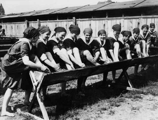These boys at a summer camp in Kent, England, in June 1931 clean their hair and faces all in a line, each using individual wash buckets.
