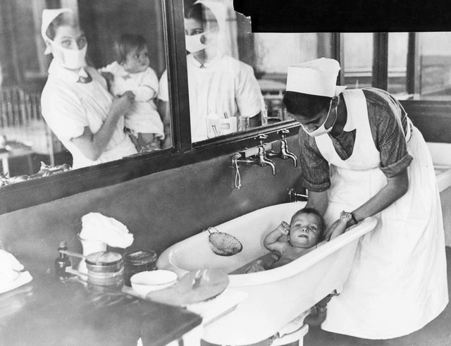 At a German women’s clinic in 1931, it’s bath time for a couple of adorable babies, one of whom is getting clean in a tiny tub. While the image is in black and white, the face masks the nurses are wearing give it an eerie kinship to today.