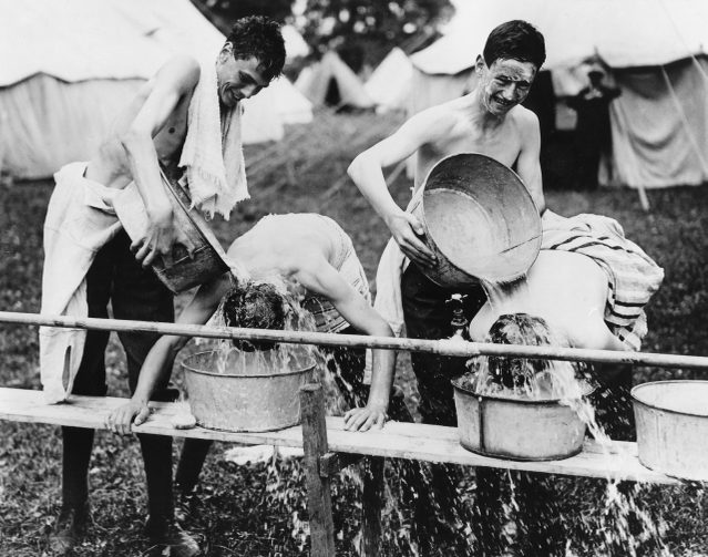 These boy scouts in Germany get a little extra help with their washing regimen as their buddies dump buckets of water over their heads, smirking all the while, in this 1927 photo. Now that’s good, clean fun.