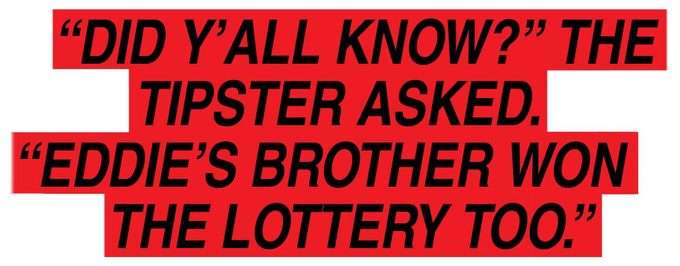 One morning a few months after the original trial, Sand’s office phone rang. The call came from area code 281, in Texas, where Eddie grew up. The caller said he’d seen an article in the newspaper about Eddie’s conviction. “Did y’all know,” the tipster asked, “that Eddie’s brother Tommy Tipton won the lottery, maybe about ten years back?”