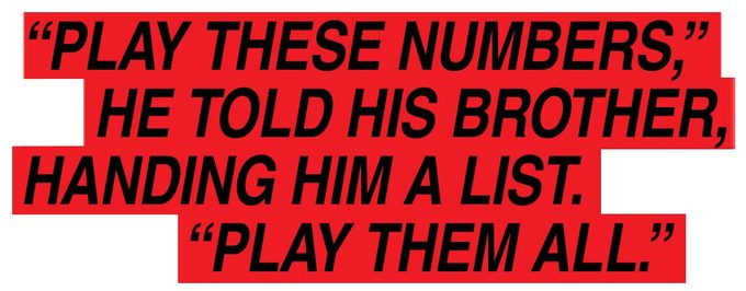 The next day, November 23, 2005, he handed the pad to his brother, who was headed to Colorado on a trip. “These numbers have a good chance of winning based on my analysis,” he said. “Play them. Play them all.”