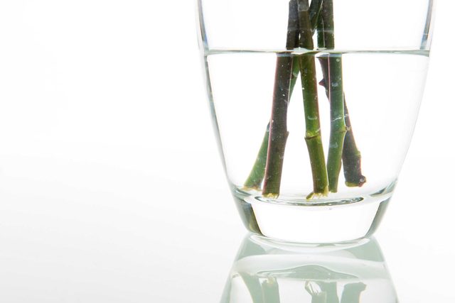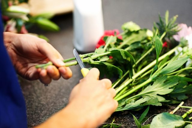 Instead, use a sharp, non-serrated knife to cut a quarter of an inch off the bottom of the stems, at an angle. While you’re at it, cut off those leaves below the water line. They breed bacteria.