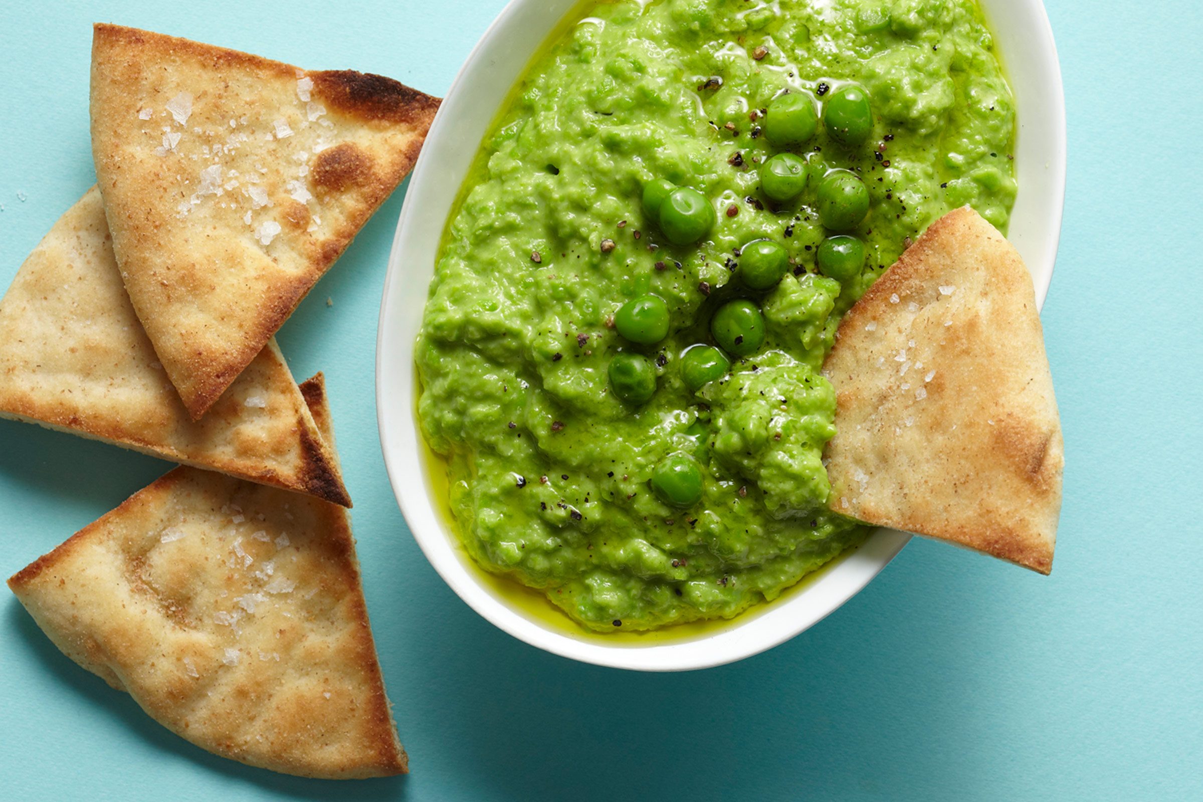 Puree 1 cup thawed peas, 2 tbs. tahini, 1 minced garlic clove, and 2 tbs. lemon juice in food processor until smooth.