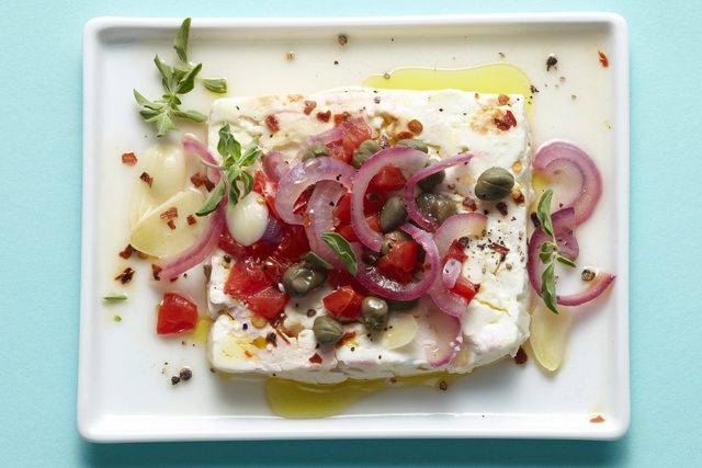 Place feta cheese, chopped tomatoes, red onions, capers, oregano, and olive oil on foil. Wrap; bake at 350°F for