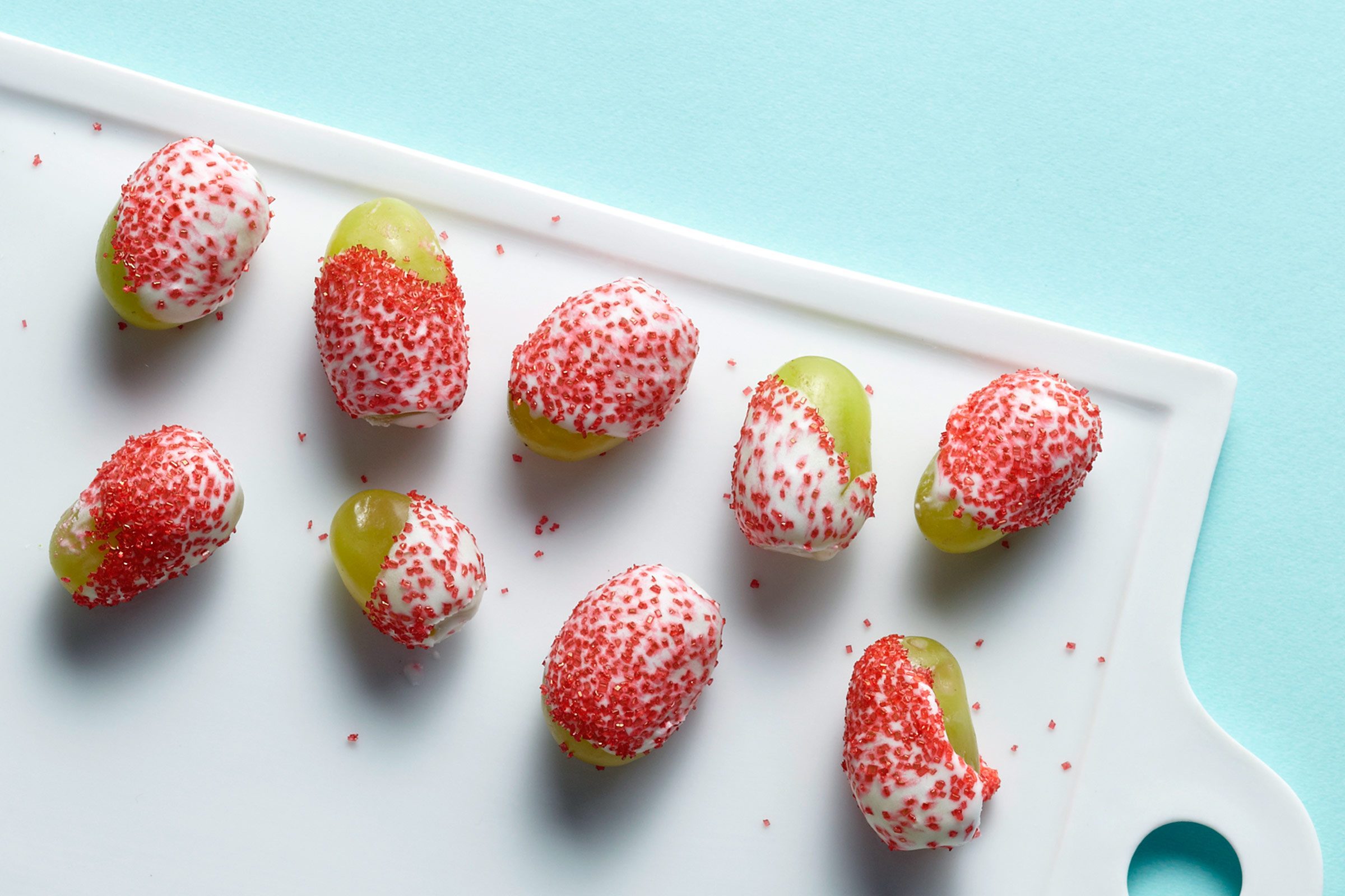 Melt white chocolate chips in microwave-safe bowl. Dip grapes in chocolate and then sugar or sprinkles. Refrigerate until set. —Food & Wine