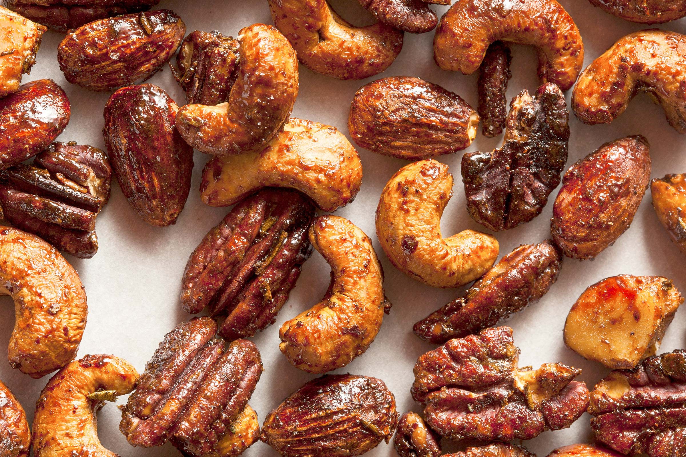 Mix 2 cups each pecans, almonds, and walnuts with ¼ cup maple syrup, 2 tbs. olive oil, 2 tbs. chopped herbs,