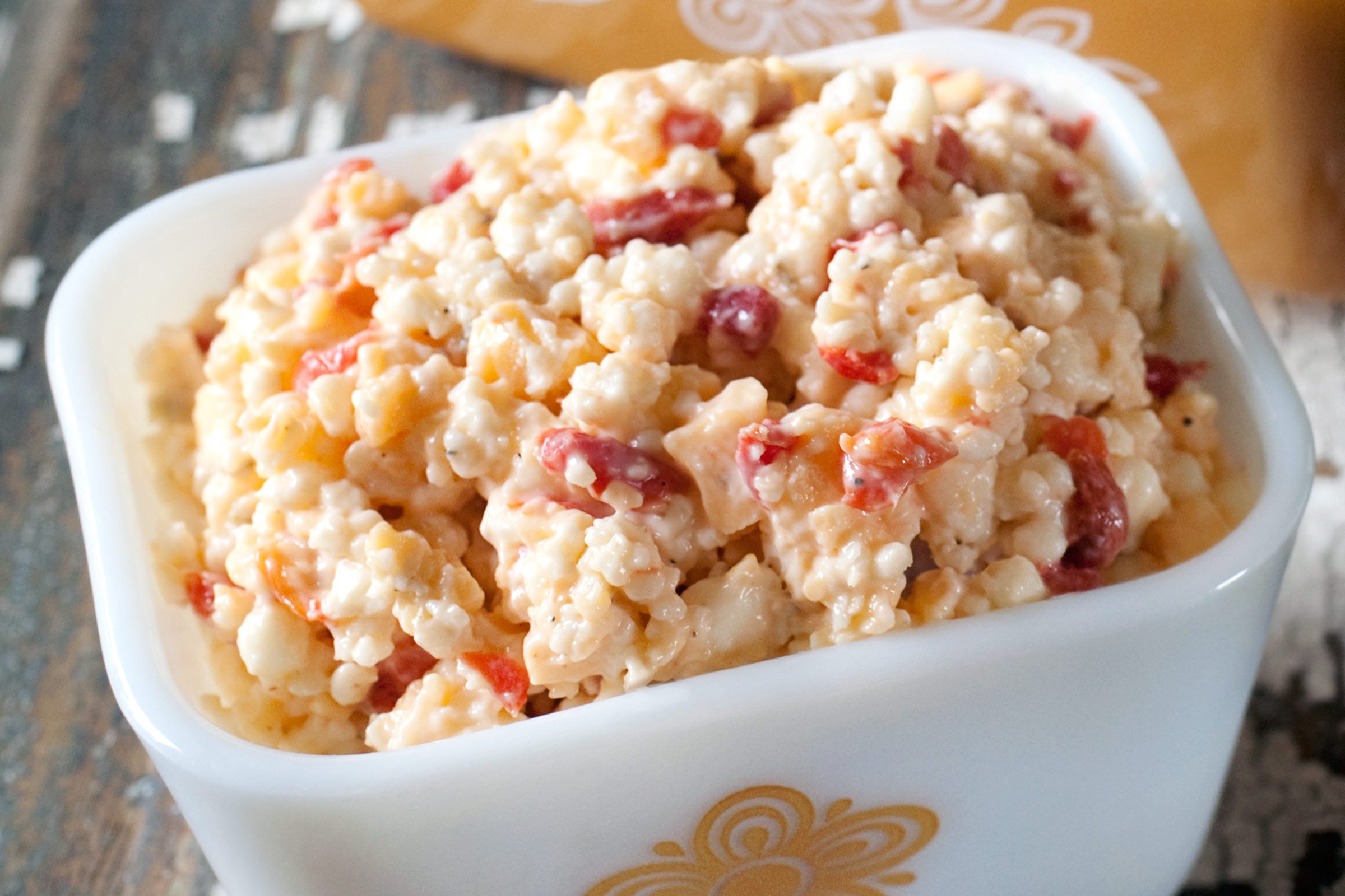 Combine ½ lb. grated sharp cheddar, ½ cup mayonnaise, 1 (4-oz.) jar drained and diced pimientos, and ½ tsp. horseradish (or hot sauce) in a bowl. —designsponge.com