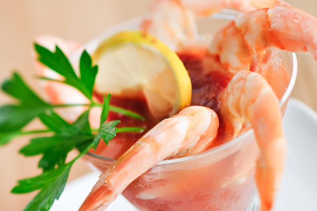 Serve shrimp cocktail with cocktail sauce (red) and salsa verde or pesto (green). —myrecipes.com