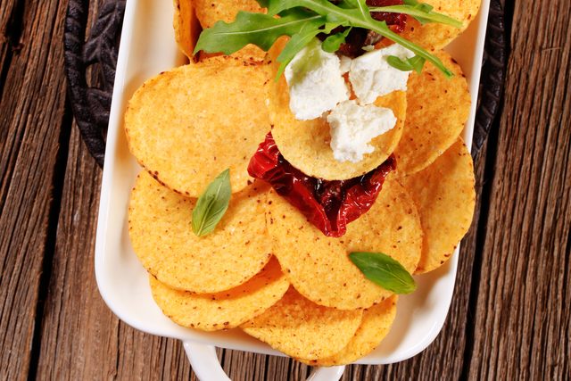 Top pita chips with feta, roasted red peppers, pepperoncini. Bake until melted; top with chopped tomatoes, olives, Greek yogurt. —Cat Cora