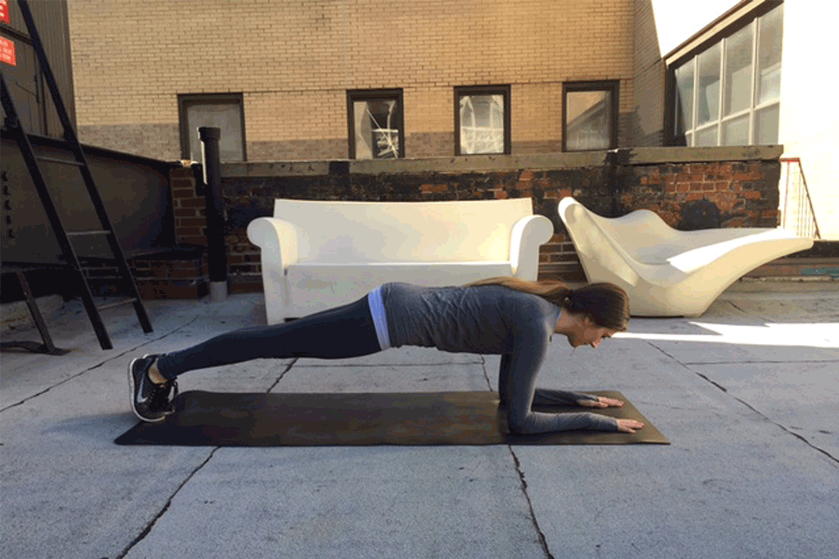 When we talk about targeting back fat, we’re also looking at our pectoral muscles. Lindsey Warner, a certified yoga instructor, recommends a classic yoga move that works many parts of the body: the chaturanga. Although probably the most common and most effective move used in power and vinyasa yoga classes, the chaturanga is often done incorrectly. “The first thing to remember is that they are difficult,” says Warner. “I would recommend for all people that are brand new to start on their knees, for sure… If your legs are really, really long, it’s just going to be better and safer in your upper body.” To begin a chaturanga, come to a high-plank position, spreading your fingers wide and stacking your wrists right underneath your shoulders. Externally rotate your arms so that the insides of your elbows face straight forward. Begin to bend your elbows and lower down, even if it’s just an inch or two. Your elbows should move straight back along your ribcage (although you should be careful not to hug in too much into the trunk of your body). The shoulder blades shouldn’t pinch and there shouldn’t be a large dip between them; keep your neck in line with your spine. Press back up and into child’s pose. Do these movements back and forth.