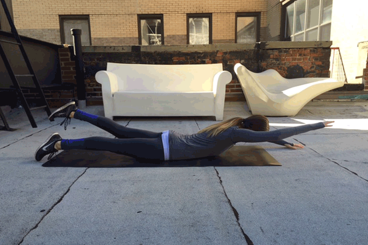 Warner recommends this floor exercise to work the arms and back while additionally strengthening the spine—a great combination for getting rid of back fat. Lying on your stomach, extend your arms and legs long. Begin to kick and paddle, lifting opposing hands and feet at the same time. Strive to lift the arms and legs equal distances off the floor, and keep your pelvis and shoulders square to the ground. Be sure to relax the neck by looking down at the ground, rather than straining it upward. (Here’s what you should be eating before your workout.)