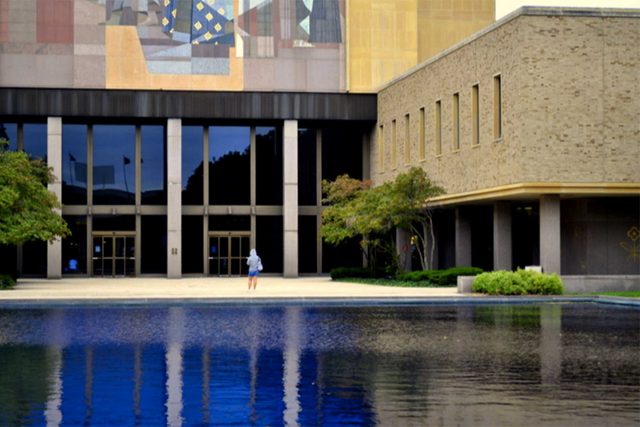 The Theodore Hesburgh Library at Notre Dame features a mural commonly referred to as “Touchdown Jesus” for it’s location directly behind Notre Dame’s football stadium’s north end zone.