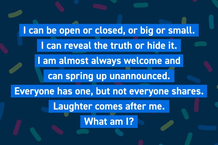 I can be open or closed, or big or small. I can reveal the truth or hide it. I am almost always welcome and can spring up unannounced. Everyone has one, but not everyone shares. Laughter comes after me. What am I?
