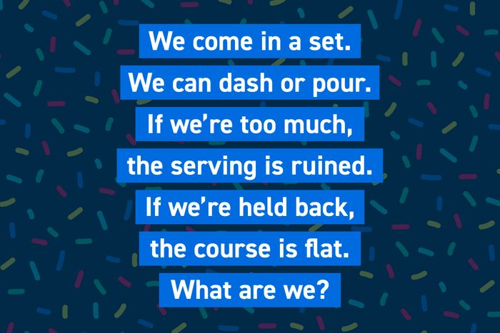 We come in a set. We can dash or pour. If we’re too much, the serving is ruined. If we’re held back, the course is flat. What are we?