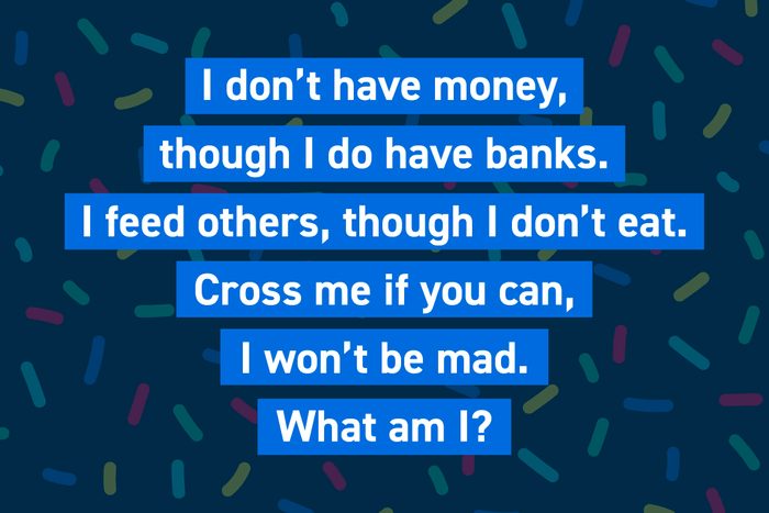 I don’t have money, though I do have banks. I feed others, though I don’t eat. Cross me if you can, I won’t be mad. What am I?
