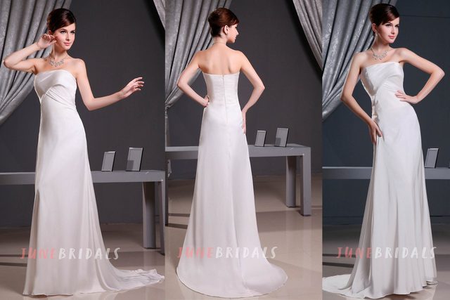 Sweetheart Satin Sheath Dress with Ruching and Brush Train, $144; junebridals.com