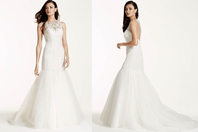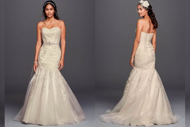 Oleg Cassini Tulle and Lace Trumpet Wedding Dress, $799; davidsbridal.com