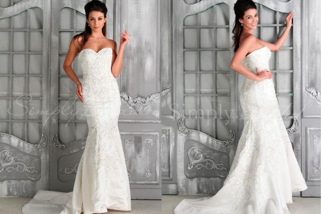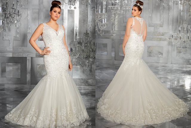 According to Hanson, mermaid dresses “can add curves to a straight figure.” So if you aren’t blessed with voluptuous, womanly assets, use the figure-shaping silhouette of a mermaid dress to create the illusion of curves. The beauty of a mermaid dress is that if you need to add length to your body, Hanson says, “they are also very flattering for petite brides,” thanks to the dropped waist and low flare, both of which elongate your torso.