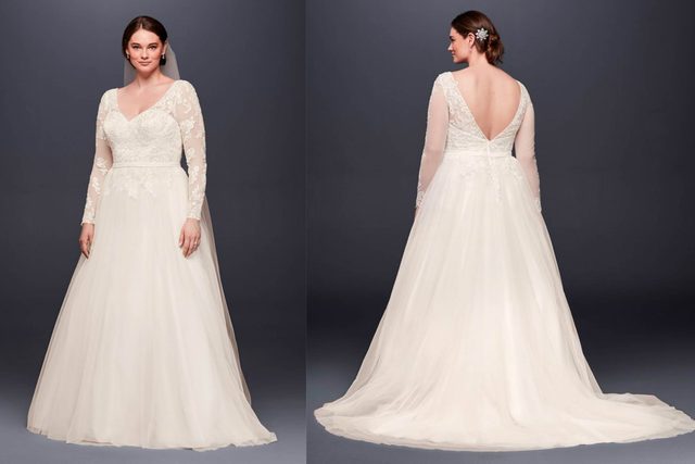 Plus Size Long Sleeve Wedding Dress with Low Back, $599; davidsbridal.com