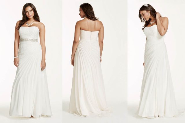 Crinkle Chiffon Draped Plus Size Wedding Dress, $349; davidsbridal.com