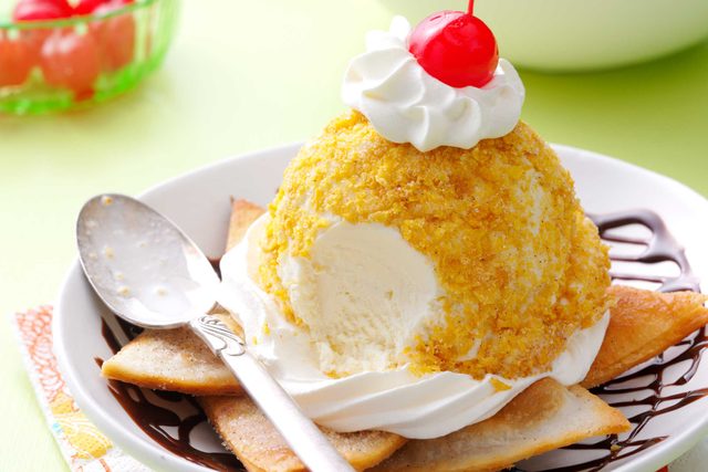 This dessert makes an impressive presentation. The flour tortillas take on a subtle flavor sprinkled with cinnamon-sugar, and they make a pleasing combination with cornflakes. Everybody loves ice cream for dessert. —Milbert Fichter Pittsburgh, Pennsylvania