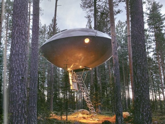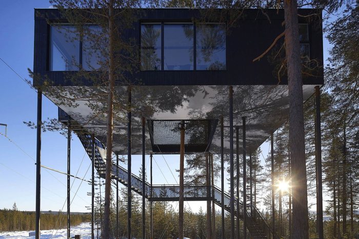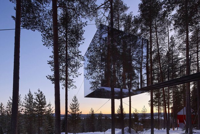 It would be easy to walk straight past Treehotel’s Mirrorcube hidden in a Swedish forest. The two-guest tree house is covered by reflective glass, making it hard to spot among the branches.