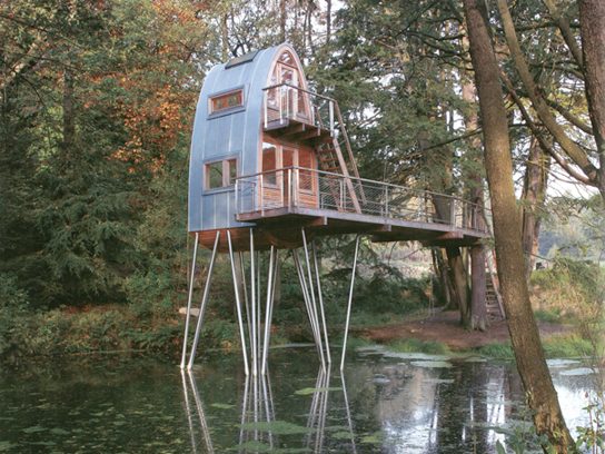 Andreas Wenning and his firm Baumraum have built more than 30 treehouse-like structures—including this two-story tower in Schonhagen, Germany—for private clients and hotels in Europe and the United States. This structure stands proudly in a pond, and its first level is reached via staircase and catwalk. About the lure of treehouses, Wenning told the blog hometreehome, “It is a space in between. It’s not on the earth, it is not in the air….[Treehouses are] a space for romantic, quietness, concentration and common space with friends and family.”