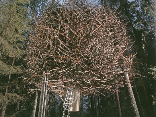 This is another of the guest “rooms” at Sweden’s Treehotel. With two bedrooms, a bathroom, and a living room, it can fit a family of four. To prevent intruders from entering the nest, the staircase is retractable.