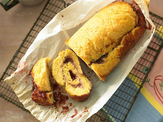 3. Spread the jam mixed with extract over the dough, leaving a 3/4 inch gap along the short sides. Roll up the dough, starting from a short side. Place the roll, still on the baking paper, onto a baking tray. Roll the baking paper up, twisting the ends to enclose.