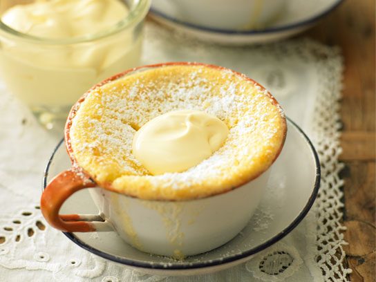 6. Bake for 20 minutes, or until the puddings spring back when gently touched (they will still be pale). Dust with icing sugar and serve immediately with cream or ice cream.