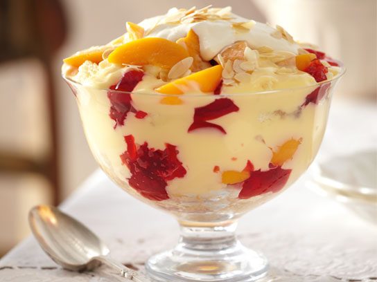 6. Just before serving, spoon the whipped cream over the trifle and sprinkle with the toasted almonds.
