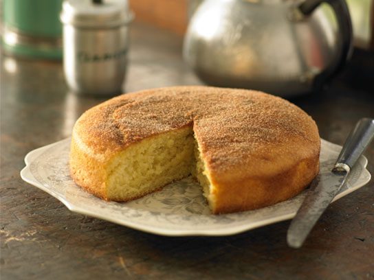 4. While the cake is still warm, brush the top with the melted butter and sprinkle with the sugar mixture. Serve warm or cold.