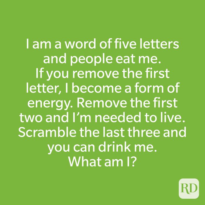 I am a word of five letters and people eat me. If you remove the first letter, I become a form of energy. Remove the first two and I’m needed to live. Scramble the last three and you can drink me. What am I?