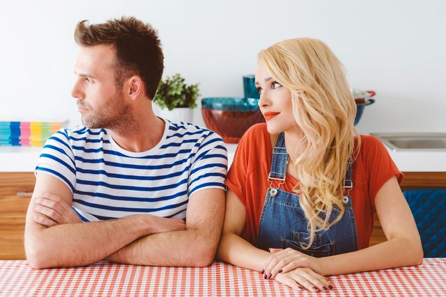 You used to stare into one another’s eyes. Now, he barely looks at you when you chat or seems uncomfortable when you do maintain eye contact. Is he hiding something? Or afraid you’ll see the truth through the windows to his soul? “If your husband can’t look you in the eye when communicating, especially if you’re attempting to communicate about problems in the marriage, he is either hiding something, like his true feelings, or he is trying to avoid conflict,” says Meyer. She suggests quickly getting to the bottom of it by asking him why he’s avoiding your glance. “He may be uncomfortable because his feelings for you are changing and he isn’t ready to say anything yet,” says Doares. Check out these secrets marriage counselors know about your relationship.