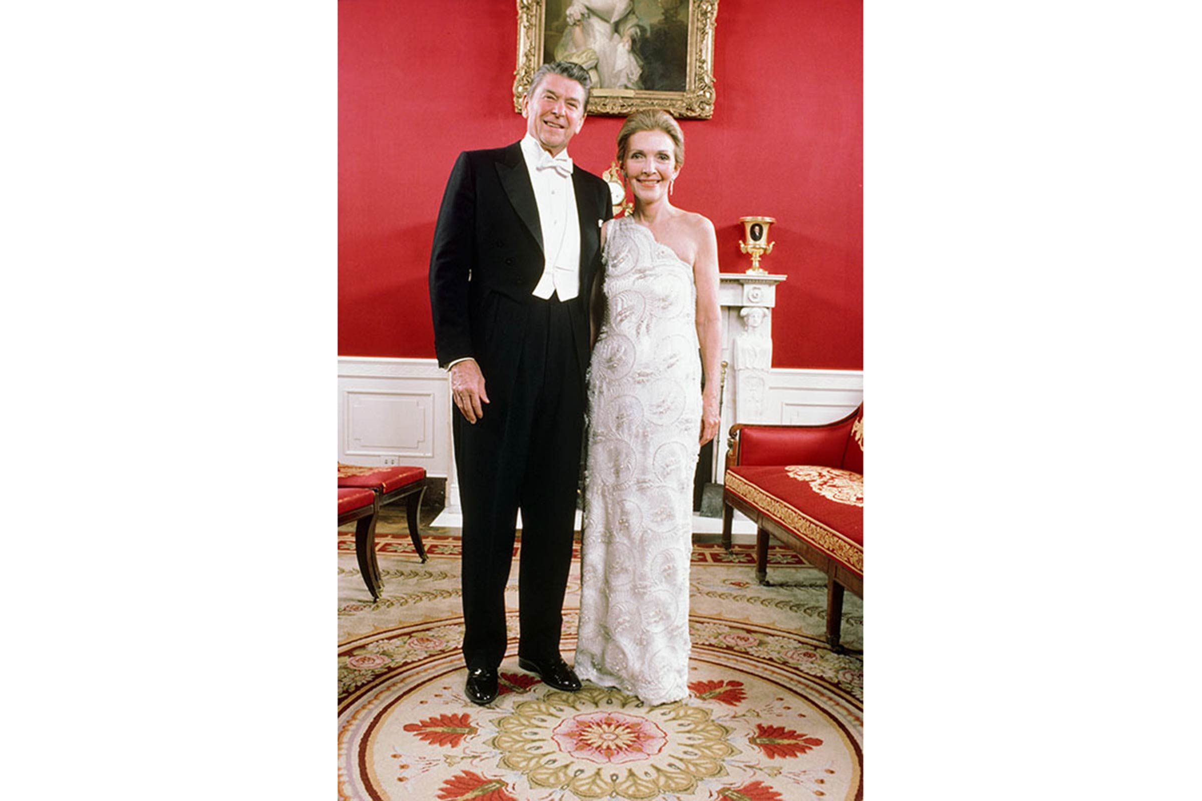 Once again, Nancy Reagan donned James Galanos for her husband’s second inauguration, but this time she wowed in a full-length, white chiffon, beaded gown. According to CBS, the Austrian and Czechoslovakian glass beads were applied by hand, which took over 300 hours to do. Learn some surprising facts you never knew about the White House.