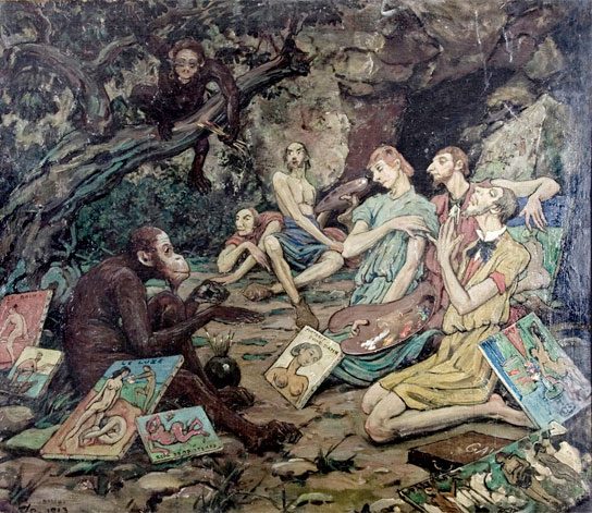 When the 1913 Armory Show brought work by Picasso, Duchamp, and Matisse to New York for their first major show, not all viewers appreciated their style. Robert Chanler, a local artist and hobnobber, took particular offense with Matisse’s bold, wildly-painted nudes and created “Parody of the Fauve Painters,” a singerie which casts Matisse as head chimp, surrounded by adoring students and controversial canvases. Subtle, no. But at least Chanler took his time to dig at Matisse with style.