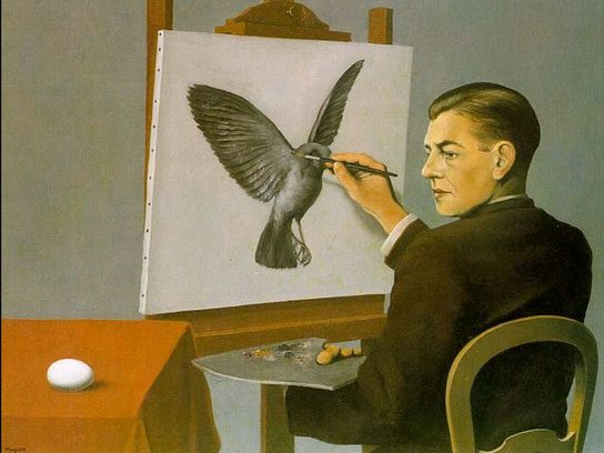 The funny, far-out visions of surrealists like René Magritte and Salvador Dalí influenced decades of graphic humor, from Monty Python to New Yorker cartoons and beyond. In this self-portrait, Magritte demonstrates his wit and forward-thinking by studying an egg to paint the bird-to-be.