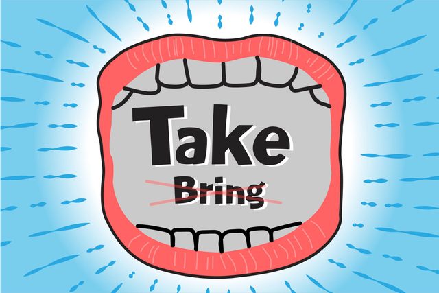 The choice depends on your point of view. Use “bring” when you want to show motion toward you (“Bring the dog treats over here, please”). Use “take” to show motion in the opposite direction (“I have to take Rufus to the vet”). The rule gets confusing when the movement has nothing to do with you. In those cases, you can use either verb, depending on the context: “The assistant brought the shot to the vet” (the vet’s point of view); “the assistant took the shot to the doctor” (the assistant’s). This is the grammar rule you didn’t know you already knew.
