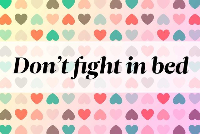 Your bed should be reserved for sleep and romance. If you start associating it with complaints or issues that you’re working through, you’ll think of it as emotionally unsafe and start to avoid each other. Hash out disagreements before turning in, or at least agree to save the discussion until morning.