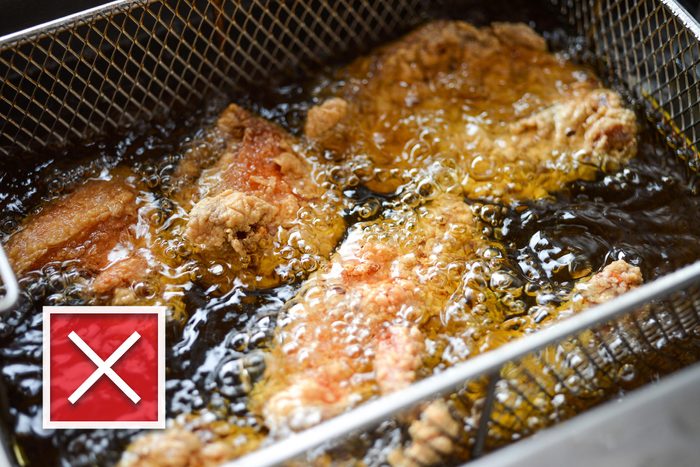 “People don’t let the oil get hot enough when deep frying and/or shallow frying chicken, which is key in keeping things crispy,” Sidoti says.”Throwing a few breadcrumbs in is an old cook’s trick. If they sizzle, then the oil should be hot enough. For shallow frying, another good visual is to look for shimmering oil in the pan. This is another sign that the oil is hot enough.”