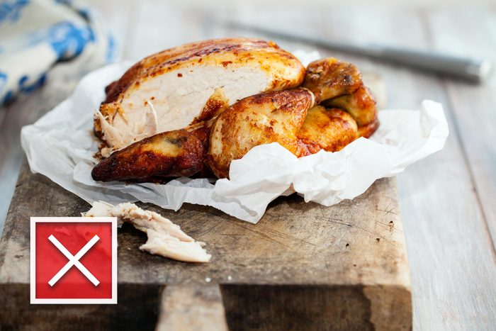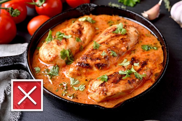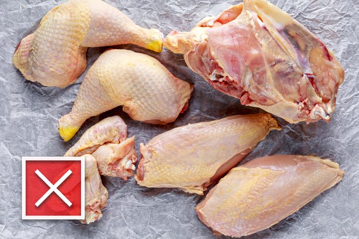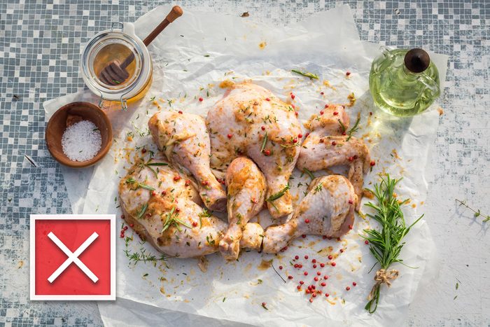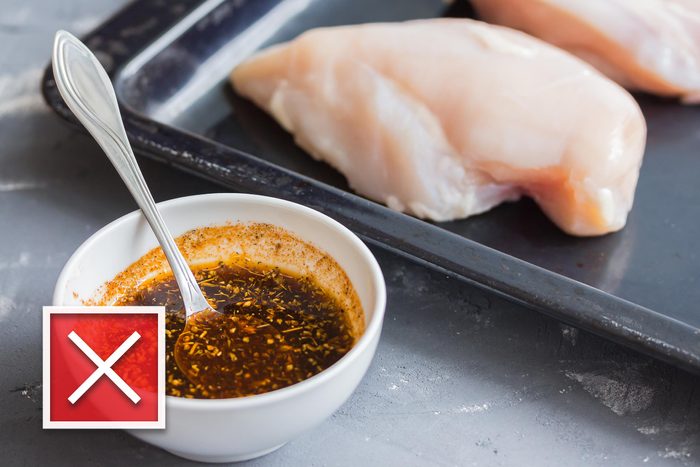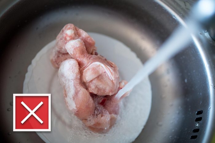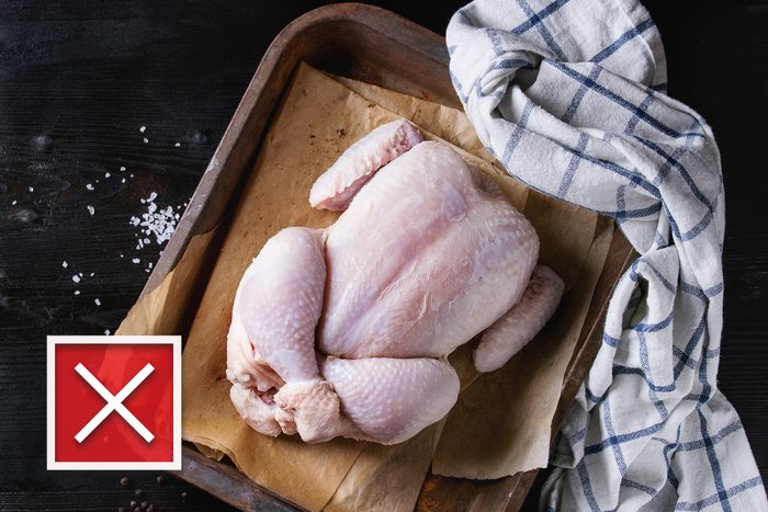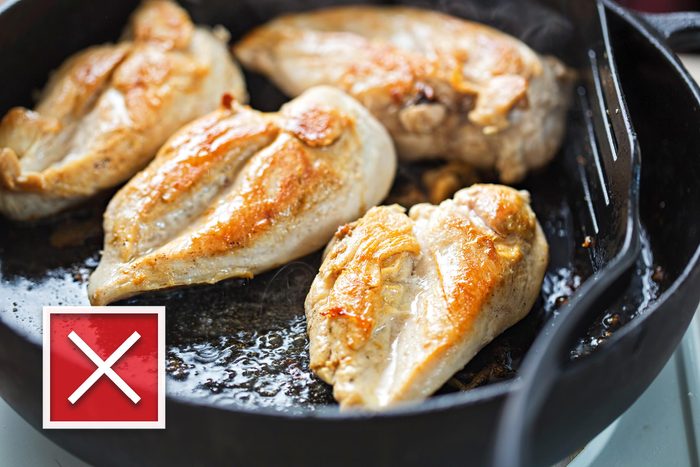 This is totally unnecessary and yet home cooks still do it all the time, especially when cooking a whole bird. “There is no need to wash the chicken in the sink,” says Hari Nayak, culinary director at Café Spice in Hudson Valley, New York. “You are most likely spraying water loaded with bacteria all over your kitchen counter near your sink, where it will sit and multiply.” Skip this step and ensure you wash all surfaces, plates, and hands after processing raw chicken, he recommends. Need some inspiration for how to cook chicken breast? Start with this irresistible homemade chicken.