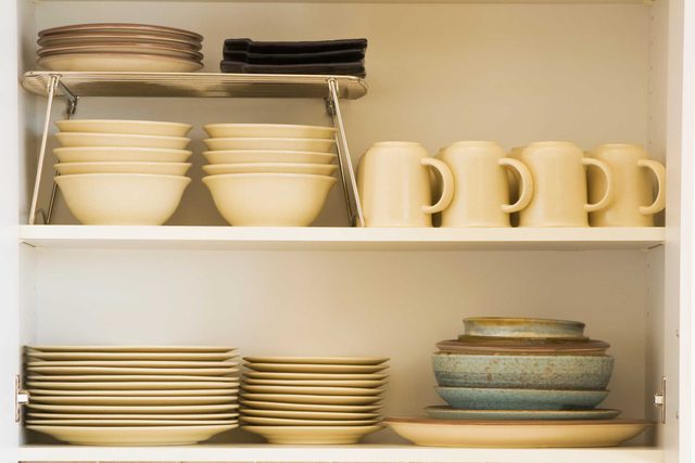 Large pots and casserole dishes can take up a lot of real estate in a cupboard. “Most people put the lid on the casserole pot and tuck it away,” says Heller. “Invert the lids of pots and store them that way.” By turning the top upside-down, you’ll create a flat surface where you can stack other items, and you’ll always know where to find the lid to each piece of cookware. Here are more tips for storing pots and pans.
