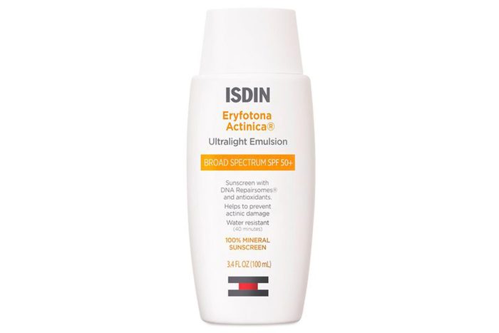 This sunscreen’s zinc will protect you, but that’s only part of why dermatologists love Isdin’s Eryfotona Actinica SPF 50+. It also contains Isdin’s trademarked DNA Repairsomes and vitamin E, both of which can help to repair existing sun damage. Plus, it goes on smoothly under makeup, so it’s a perfect everyday choice. “It’s a very light lotion—considerably lighter than other sunscreens in this category—so it’s really easy to spread onto the skin,” says Dr. Mudgil. “Patients love it, as do I.”
