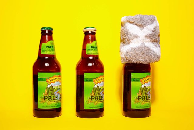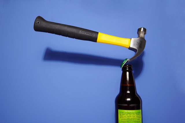 A household hammer gives you several options for opening a bottle. As seen here, you can turn the hammer sideways to pry the cap’s teeth up one by one as we did with our fork and staple remover. If you’re a little bolder, you can turn the hammer upside down and give the forked end a mighty pull against the cap, taking it off in one fell swoop. Or, if you are truly desperate, you can smash the bottle to bits in your sink and strain the beer through a sieve. This method is not recommended.